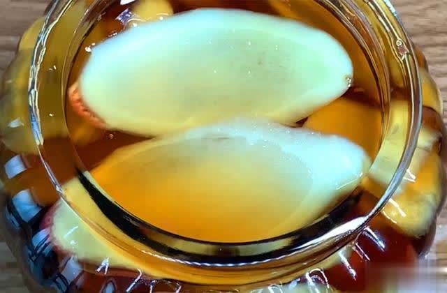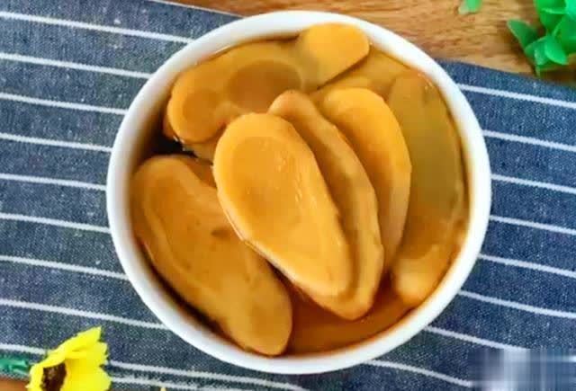 夹出来看下,姜片都上色了,就可以吃了,这样做的醋泡姜片,特别适合夏天吃,消暑又去火,每天吃上2-3片,开胃下饭,喜欢的朋友收藏试做一下吧。