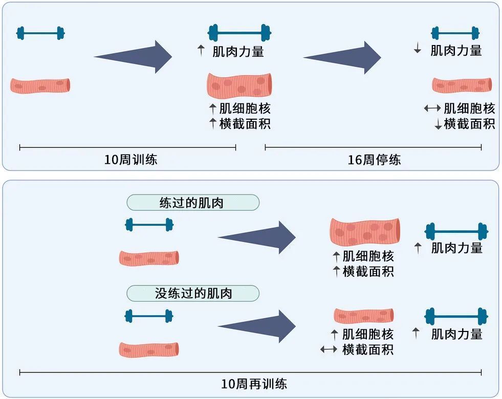 2024年挪威一项研究显示,经过10周抗阻训练,肌细胞核数量增加13%~34%,同时肌细胞横截面积增加30%。停练16周后,横截面积降低21%,但肌细胞核数量没有明显变化。再次训练10周后,横截面积再次明显增长,肌细胞核数量略有增加。