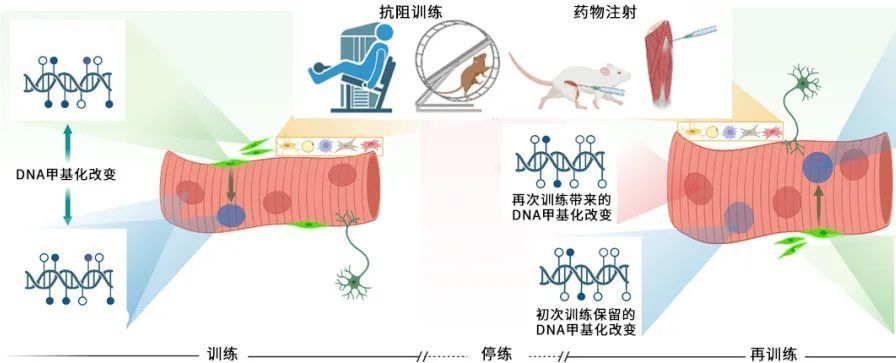 上文约翰摩尔斯大学进行的研究,第一次报道人类肌肉对抗阻训练具有表观遗传记忆。经过全基因组DNA甲基化分析,研究发现7周训练后,AXIN1、UBR5等基因出现低甲基化和表达增强。即使停练7周后肌肉质量降低,这些基因也继续保持低甲基化状态,并在再次训练后发生最大的低甲基化、基因表达和肌肉质量增长。