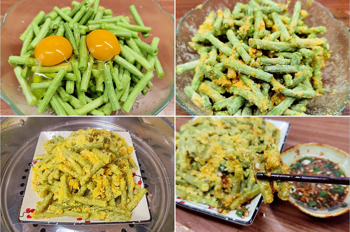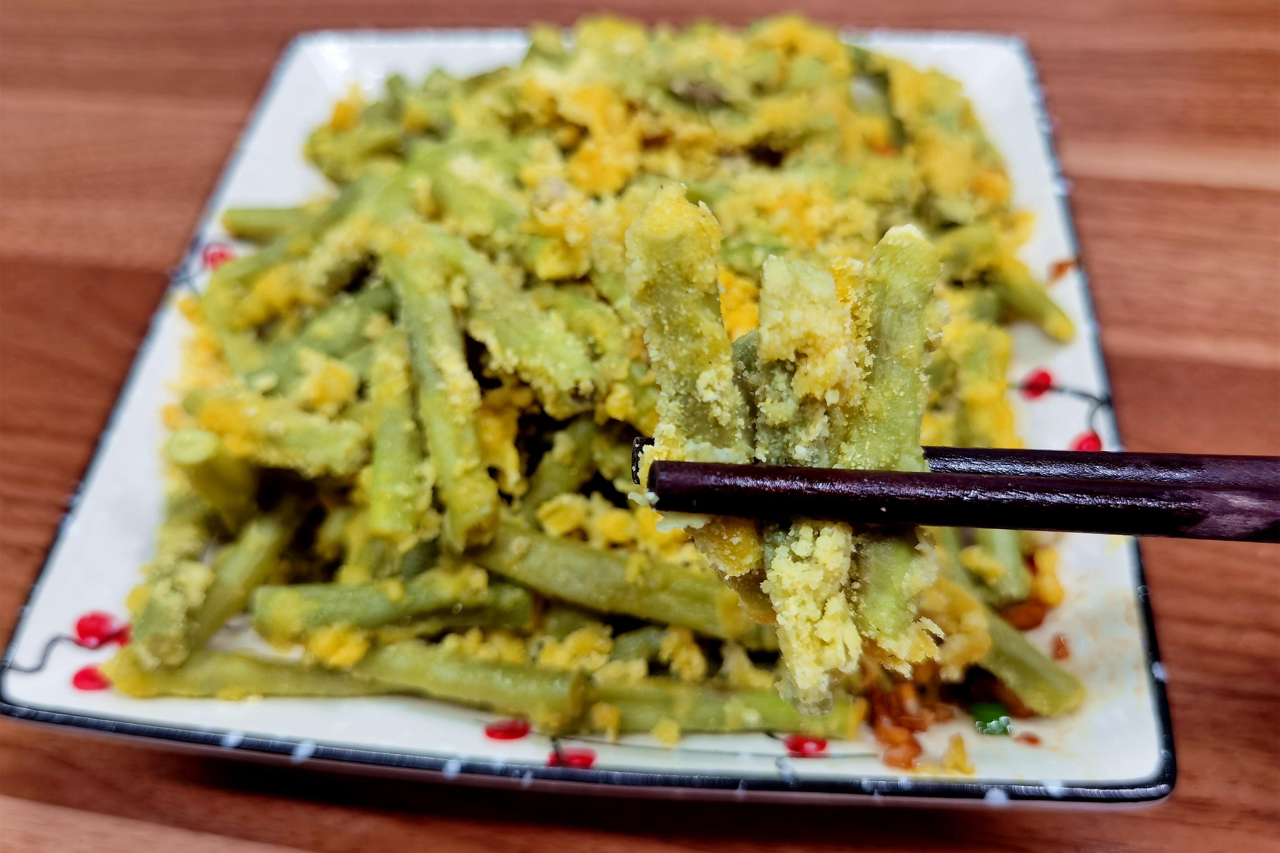 做法:新鲜豆角洗净,摘去老筋,掰成或切成寸段。豆角段放入盆中,打入2个将鸡蛋,淋入少许食用油,拌匀。分次撒入适量玉米面和面粉,边撒边翻拌,直至每根豆角都均匀裹上一层薄薄的玉米面(似霜非霜状态)。均匀铺在蒸屉上,水开上锅,大火蒸8-12分钟至豆角熟软。取出趁热抖散,依口味蘸蒜泥、醋、生抽等调制的料汁食用。