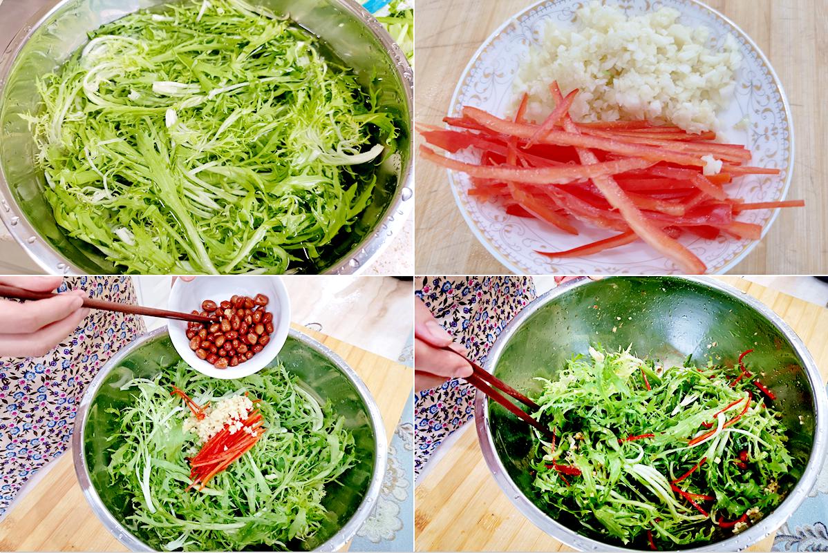 做法:新鲜苦菊洗净,沥干水分,撕成小段。彩椒洗净,切丝,取碗,调入适量蒜末、生抽、香醋、几滴香油、少许盐与糖,搅拌均匀,将料汁浇在苦菊和彩椒丝上,最后拌入炸好的花生米,撒上白芝麻即可。