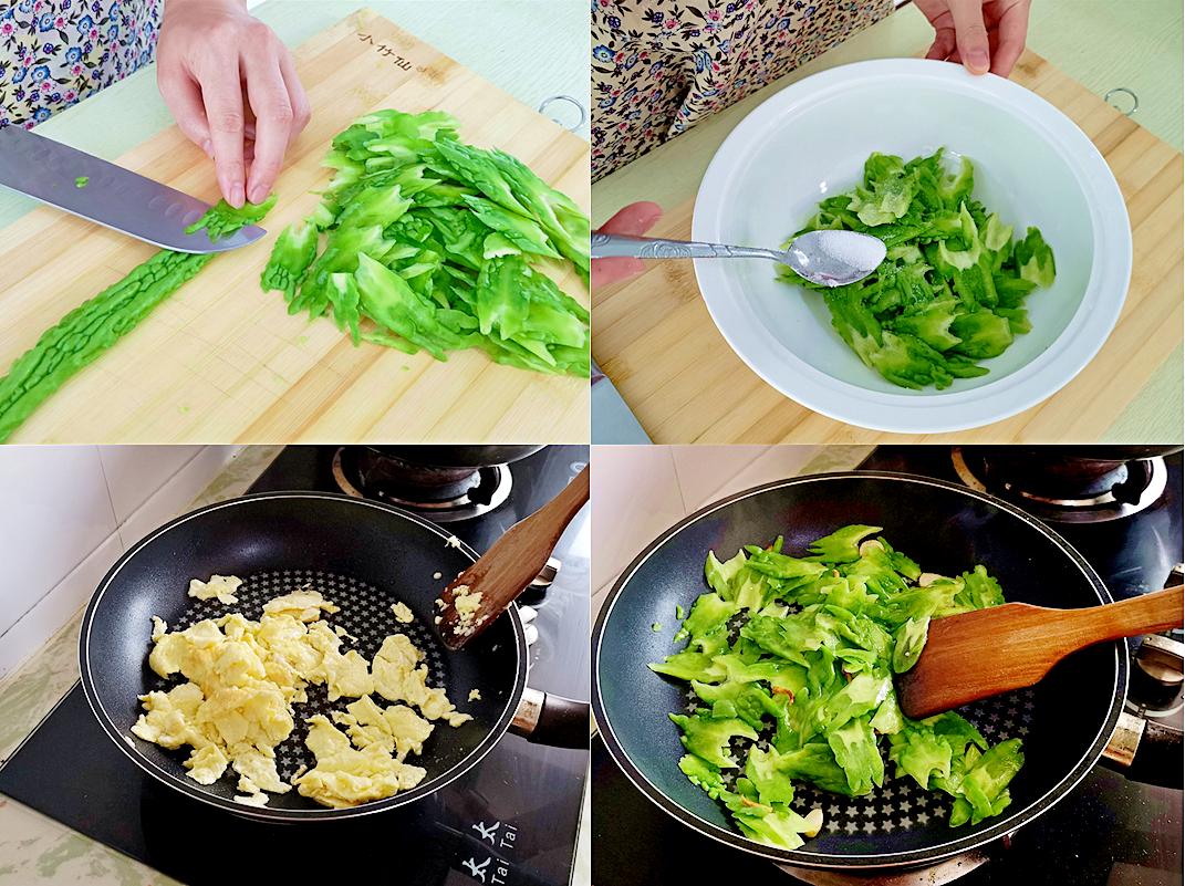 做法:苦瓜对半切开去瓤,斜刀切薄片,撒少许盐稍腌片刻挤出部分苦水。鸡蛋打散加少许盐搅匀。锅热油,先滑炒鸡蛋至嫩熟盛出。余油爆香蒜末,下苦瓜片快速翻炒至断生,倒入鸡蛋,加少许盐、糖(可选)调味,炒匀即出锅。