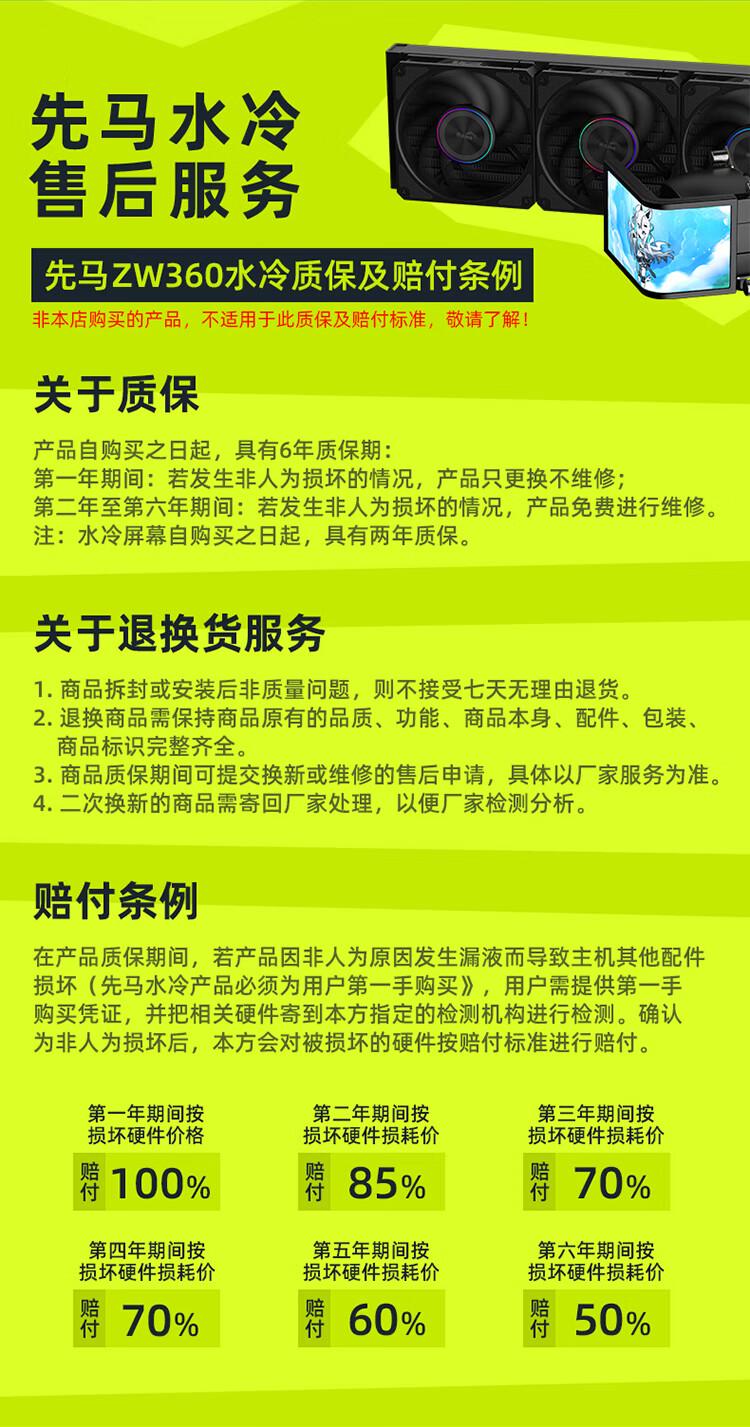 先马 ZW360 Ultra 一体式水冷兼容 LGA 115X / 1200 / 1700 / 1851 / 1566 / 2011 和 AMD AM4 / AM5 平台,享受含漏液赔付的 6 年质保。